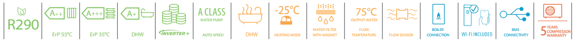 Aukšto efektyvumo HP šilumos siurbliai su 185 l nerūdijančio plieno karšto vandens ruošimo talpa ir trieigiu vožtuvu su pavara. Maksimali paruošto karšto vandens temperatūra 65 °C.